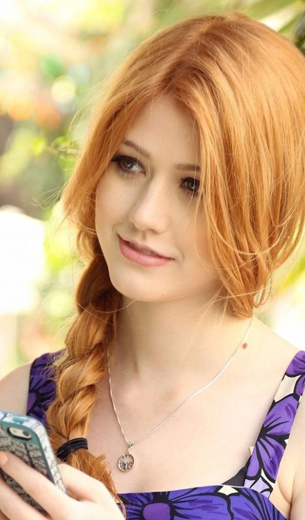 Обои Девушка Кэтрин Макнамара с телефоном в руке
