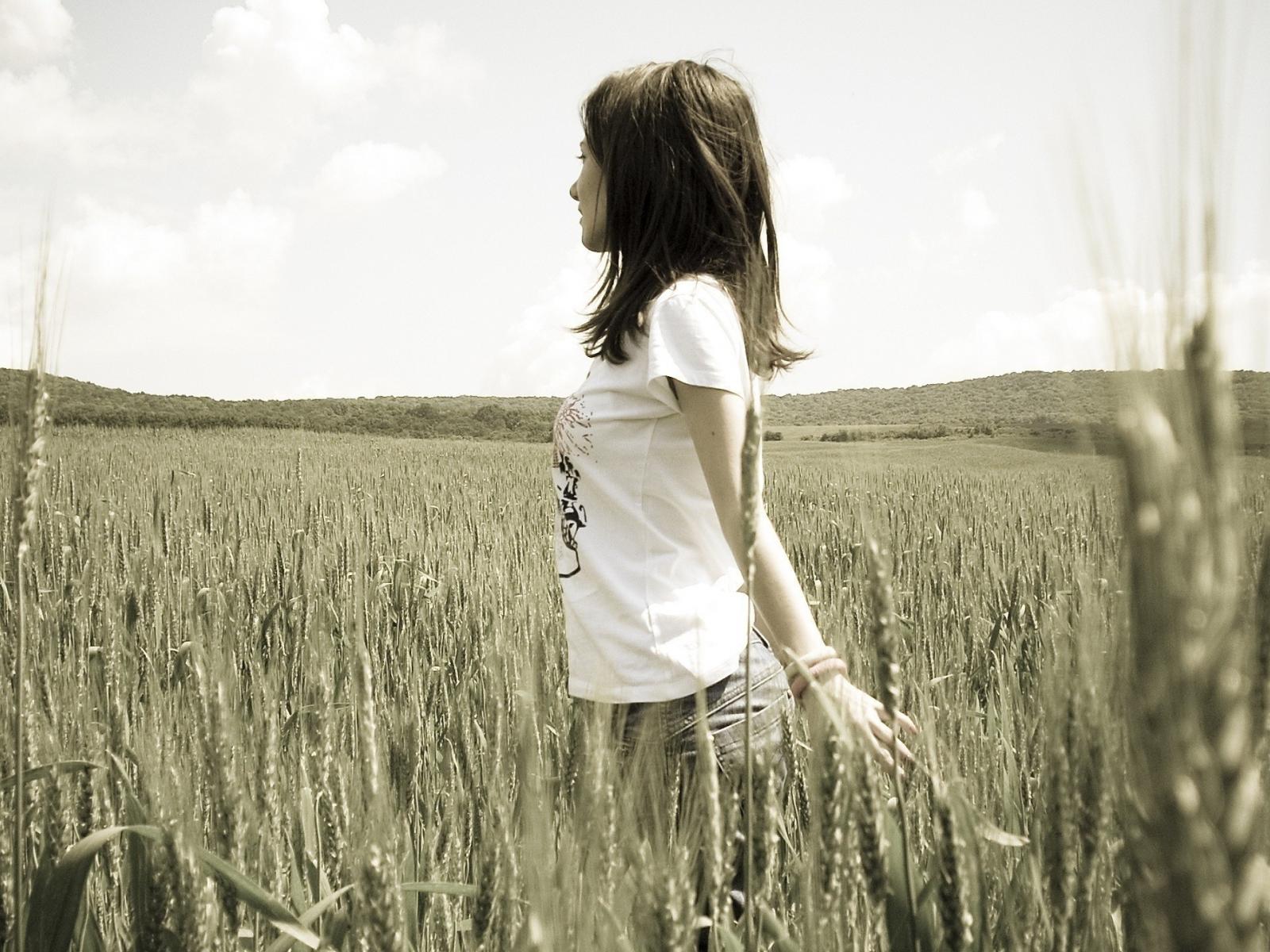 Обои Девушка в белой футболке гуляет по пшеничному полю