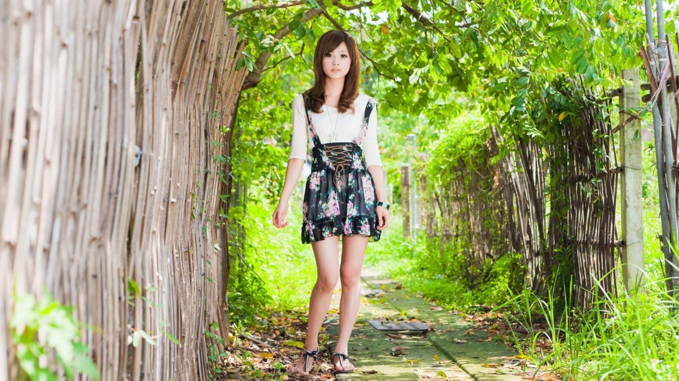Обои Японская девушка у бамбукового забора