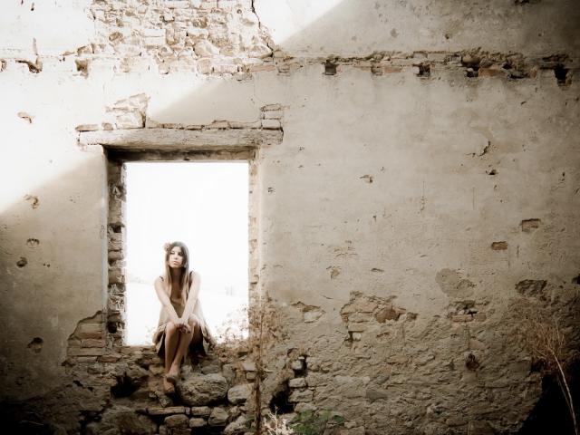 Обои Девушка на окне в руинах