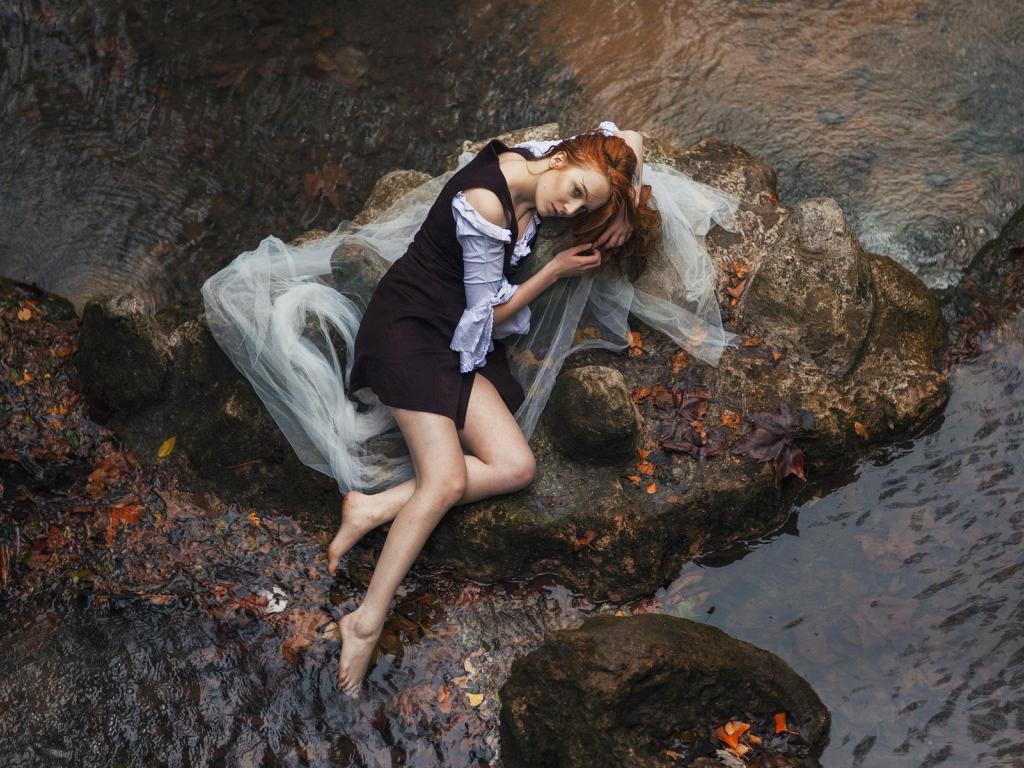Обои Девушка лежит на камне среди воды