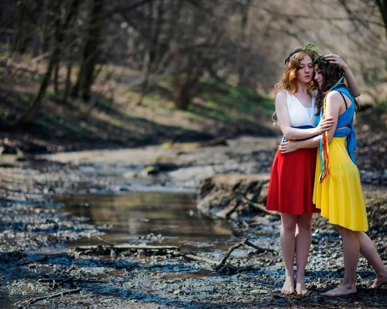 Обои Две девушки в ярких платьях в чаще леса