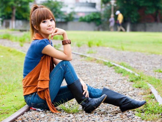 Обои Японская девушка сидит на трамвайном пути