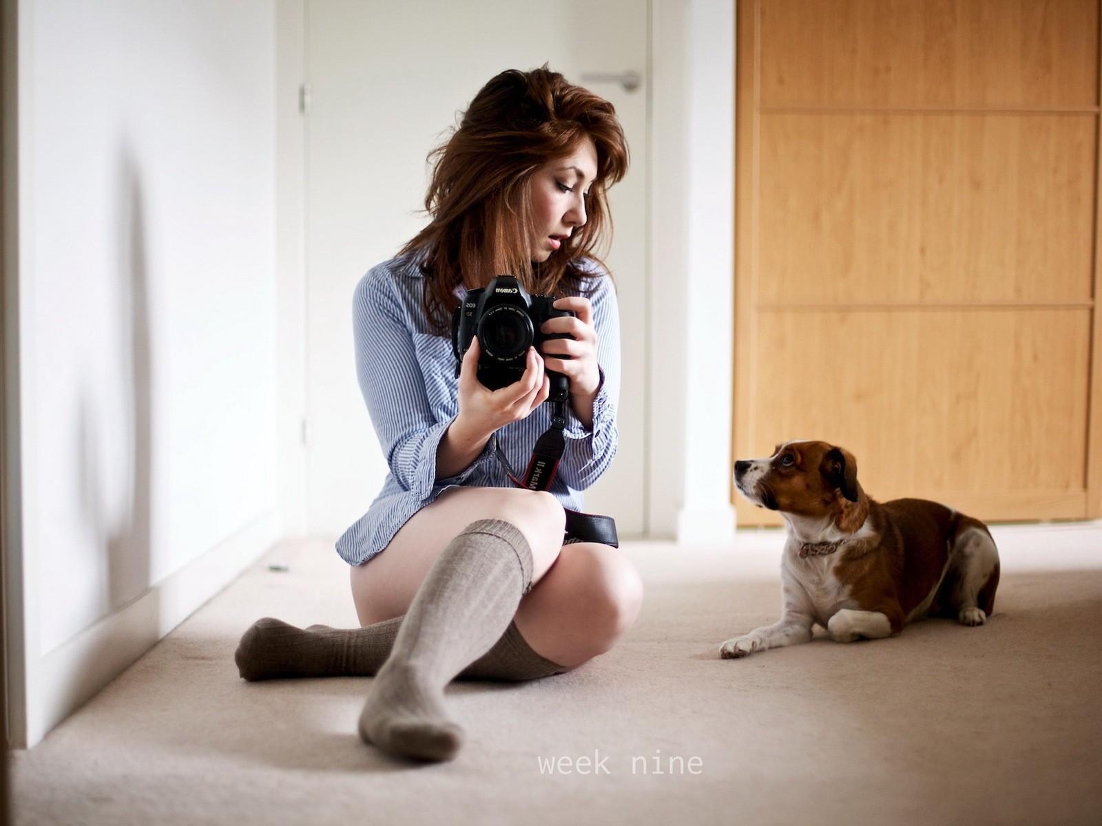 Обои Девушка фотограф со своей собакой