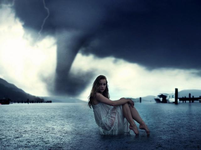 Обои Девушка позирует на фоне торнадо