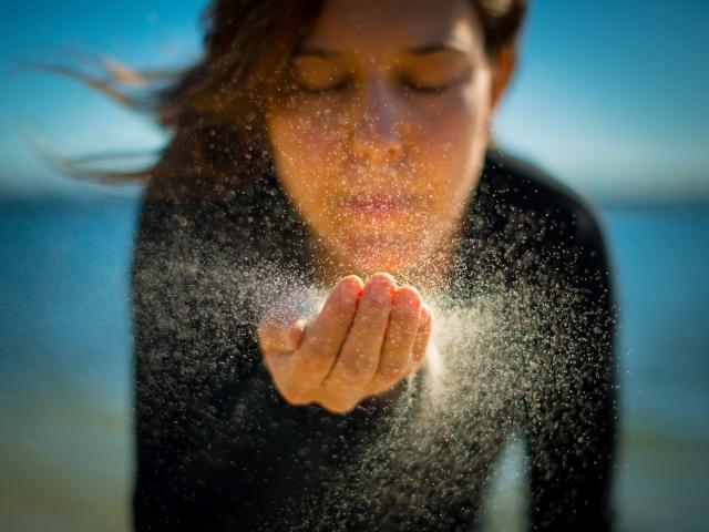 Обои Девушка сдувает песок с руки