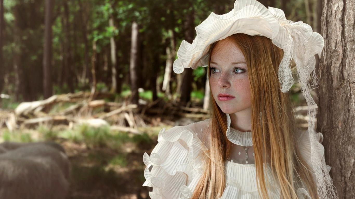 Обои Веснушчатая девушка в белой шляпке стоит у дерева