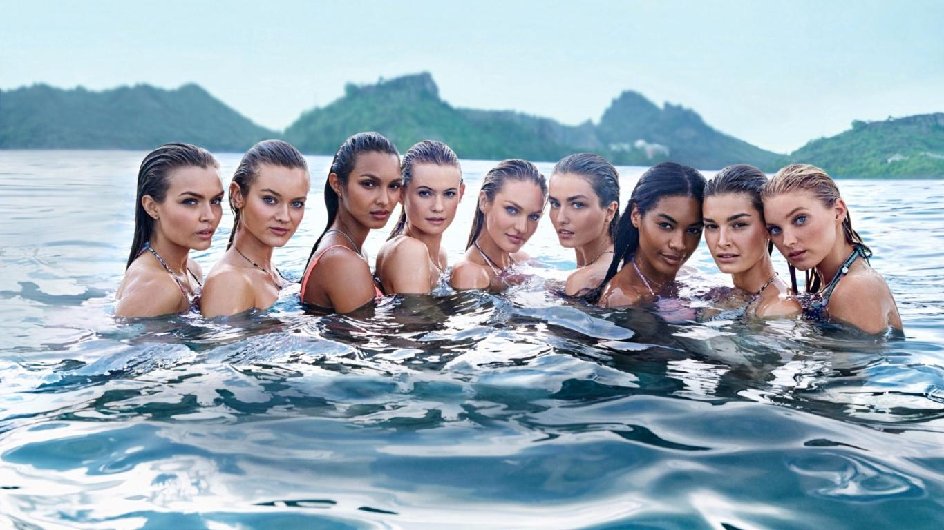 Обои Девушки стоят в воде озера по плечи