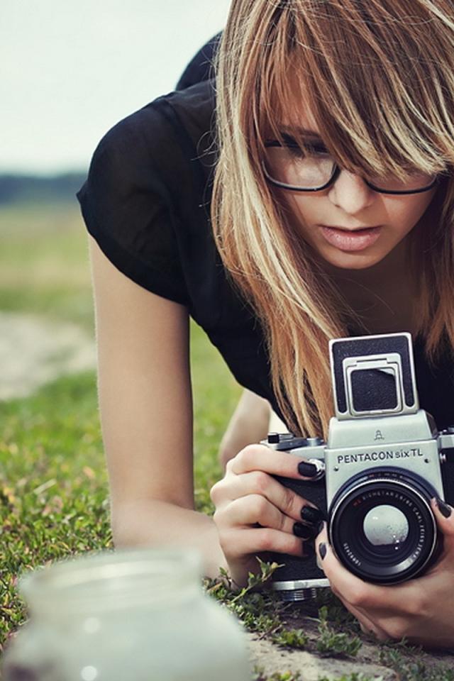 Обои Девушка в очках фотографирует траву