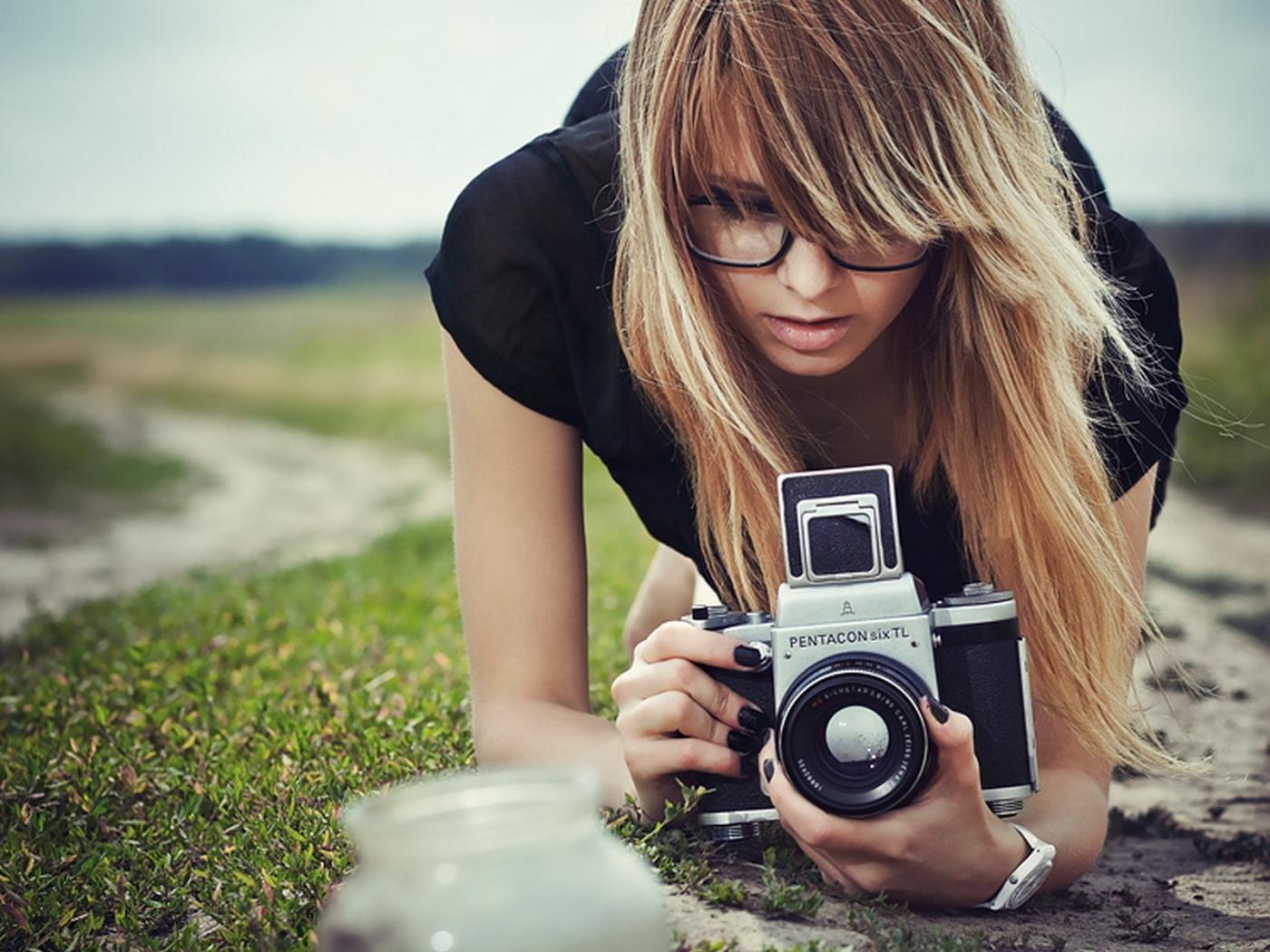 Обои Девушка в очках фотографирует траву