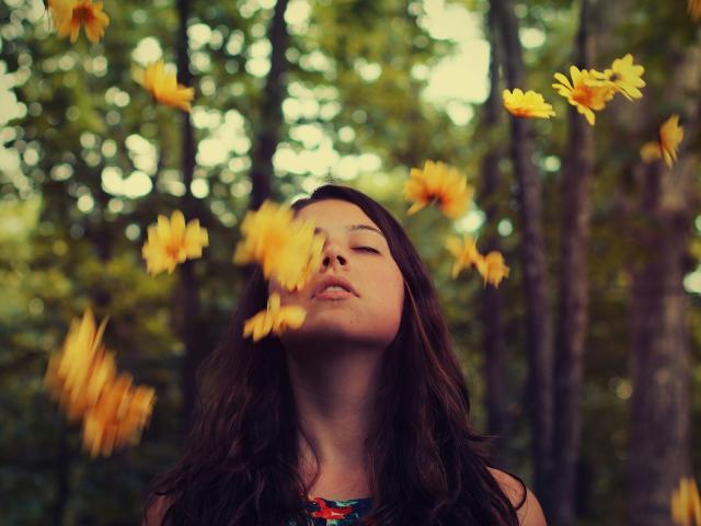 Обои Девушка подбросила желтые цветы