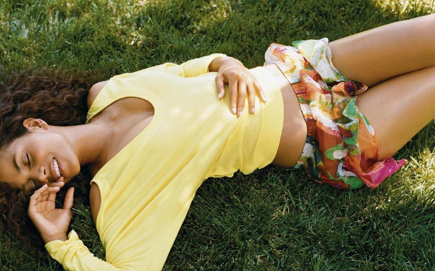 Обои Мулатка в желтой футболке лежит на траве