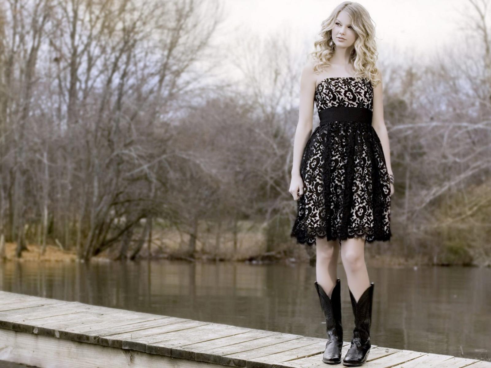 Обои Девушка в черном платье и кожаных сапогах