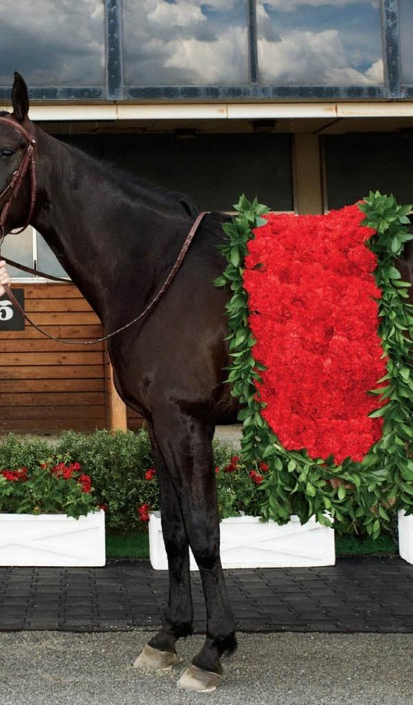 Обои Девушка в красном платье с черной лошадью