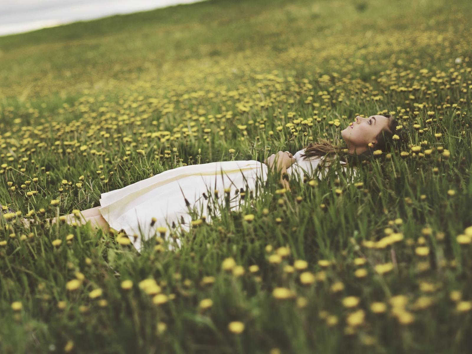 Обои Девушка лежит в поле среди одуванчиков