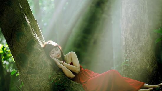 Обои Девушка прилегла отдохнуть на стволе дерева