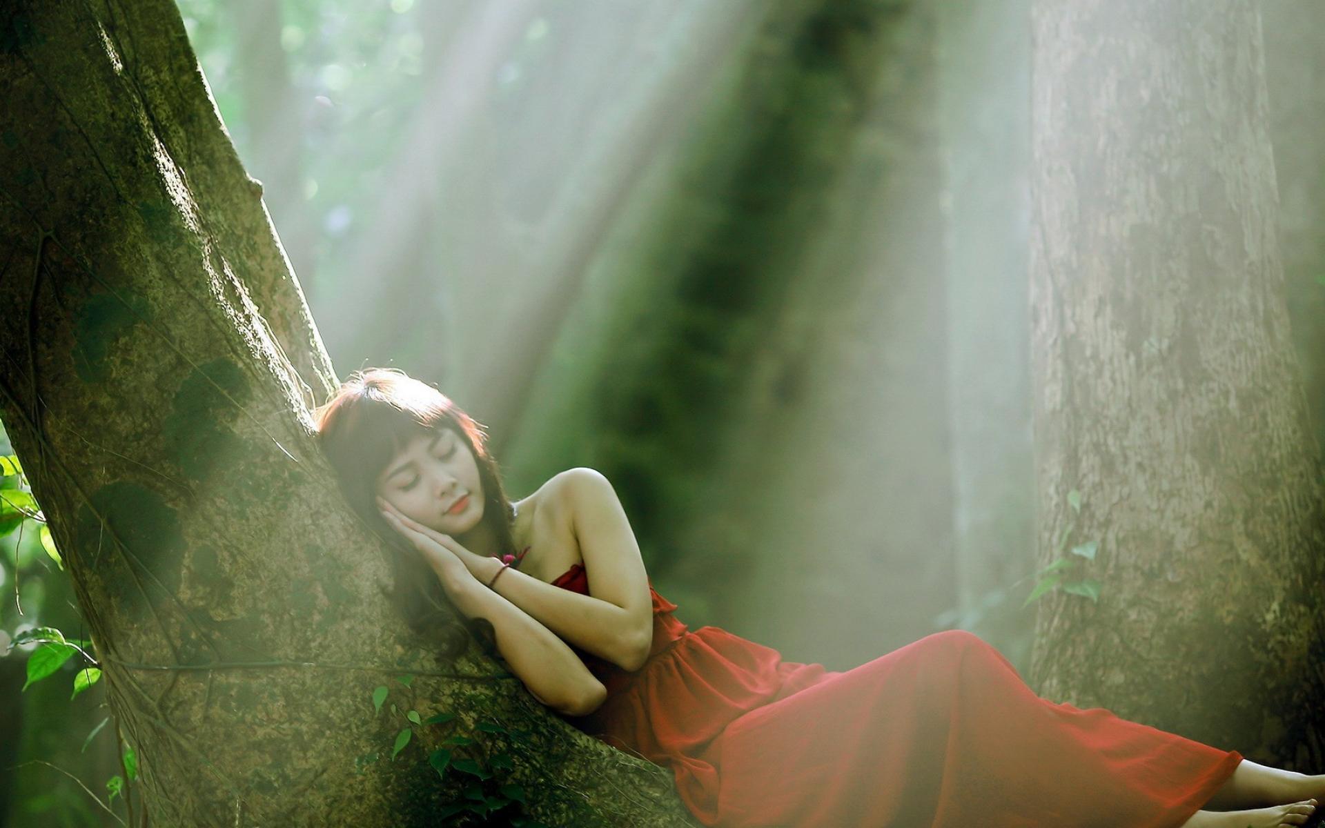 Обои Девушка прилегла отдохнуть на стволе дерева