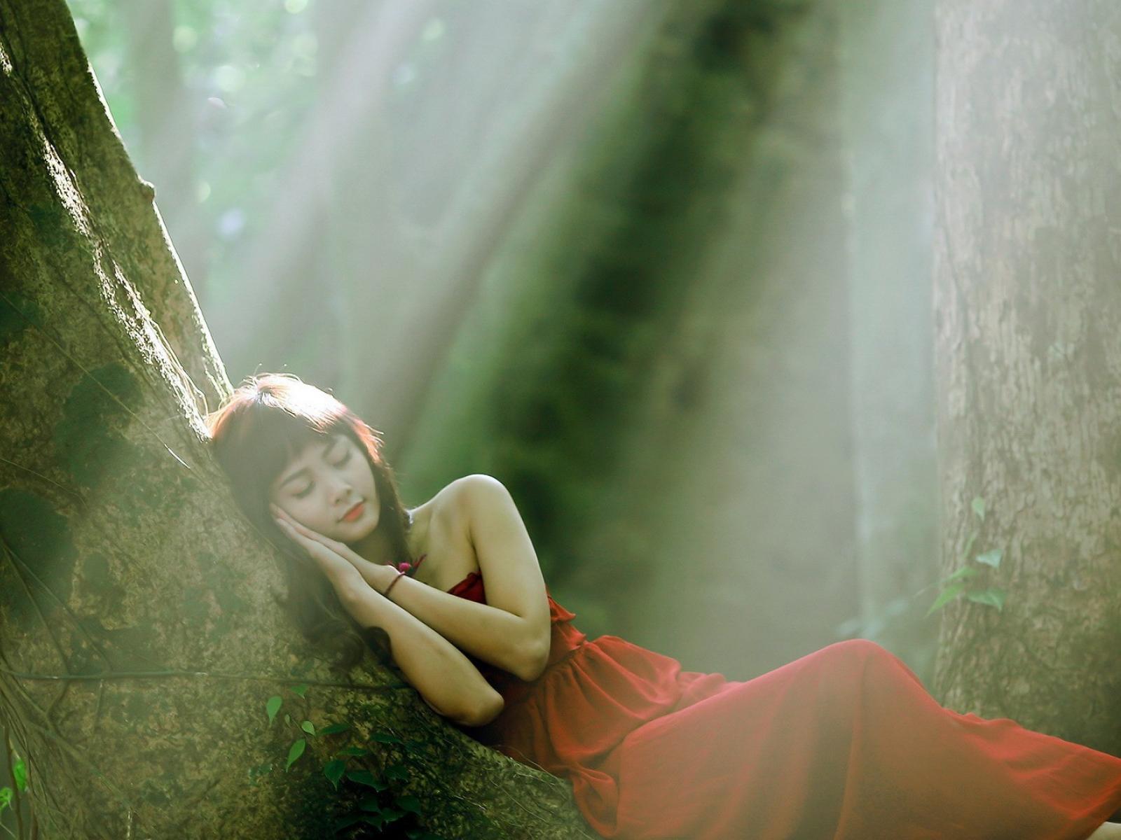 Обои Девушка прилегла отдохнуть на стволе дерева