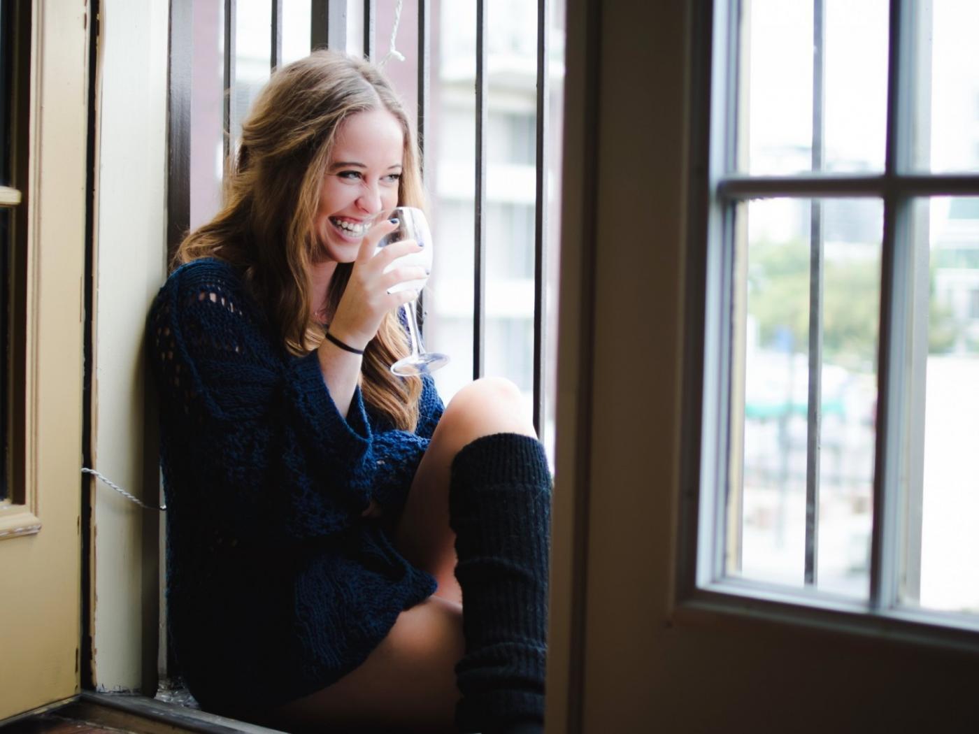 Обои Блондинка пьет вино и смеется