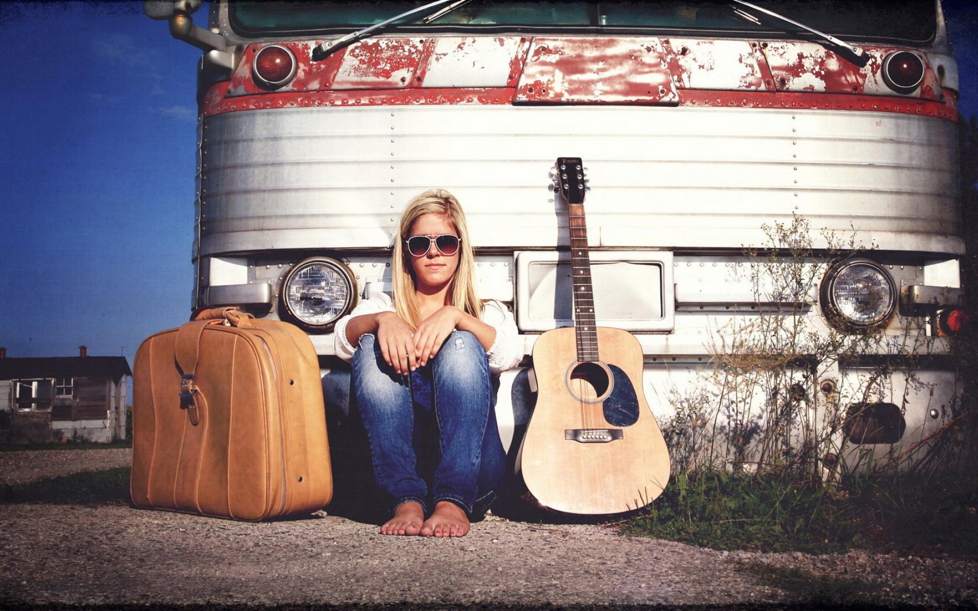 Обои Девушка с гитарой и чемоданом