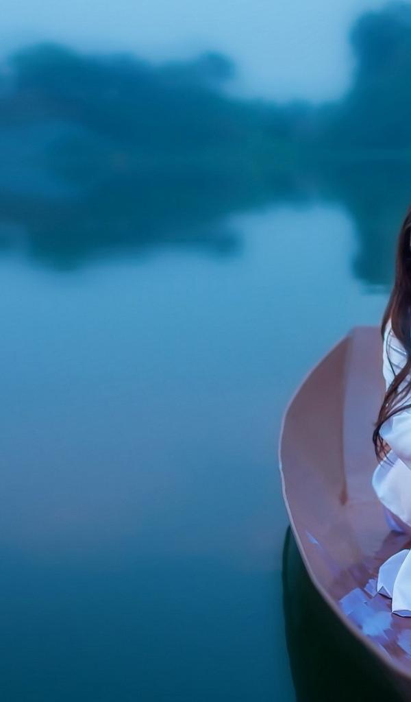 Обои Японская девушка сидит в лодке на озере