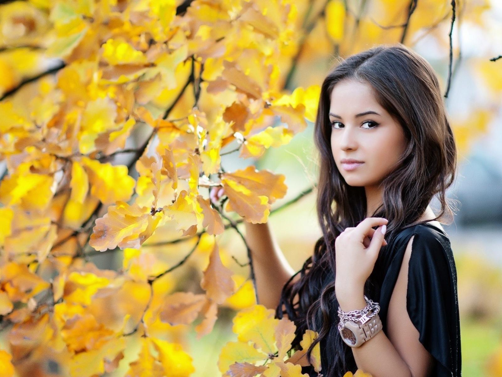 Обои Молодая брюнетка у осеннего дерева