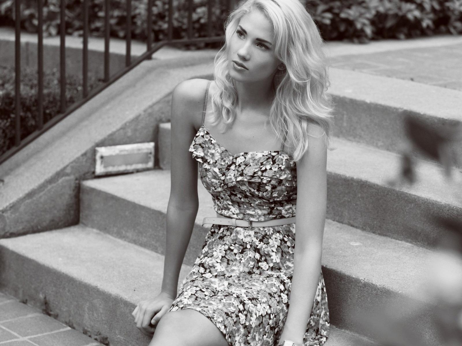 Обои Девушка Берит Баркланд сидит на ступенях
