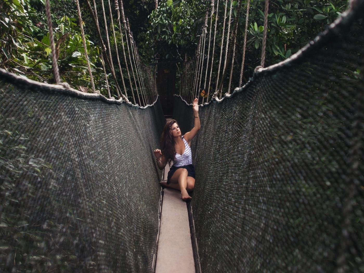 Обои Девушка сидит на подвесном мосту