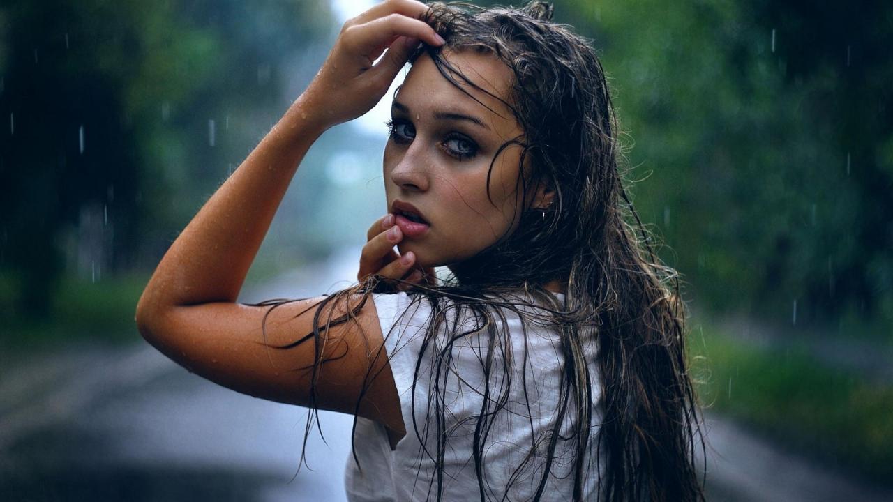Обои Девушка брюнетка вымокла под дождем