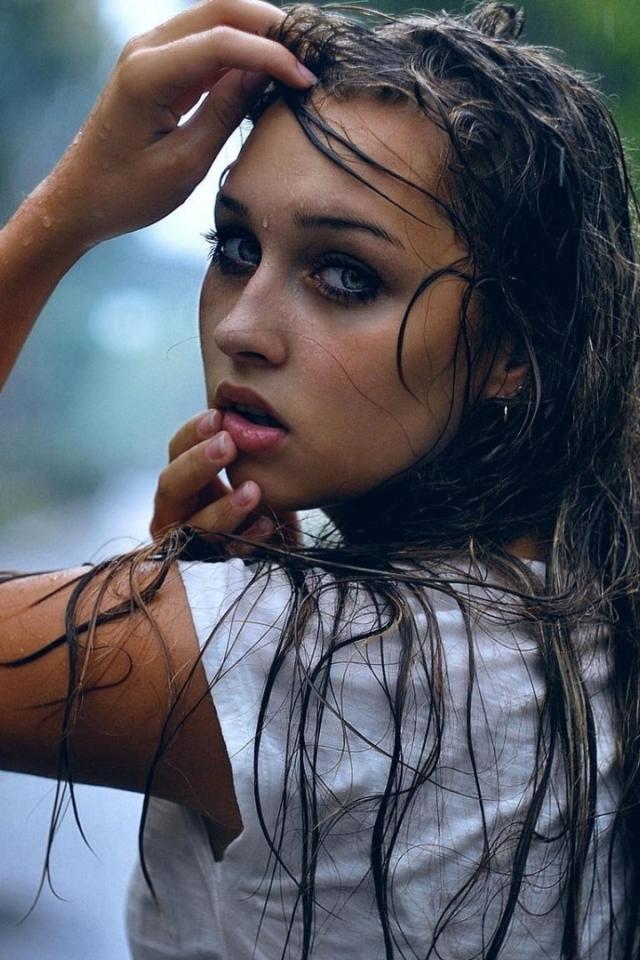 Обои Девушка брюнетка вымокла под дождем