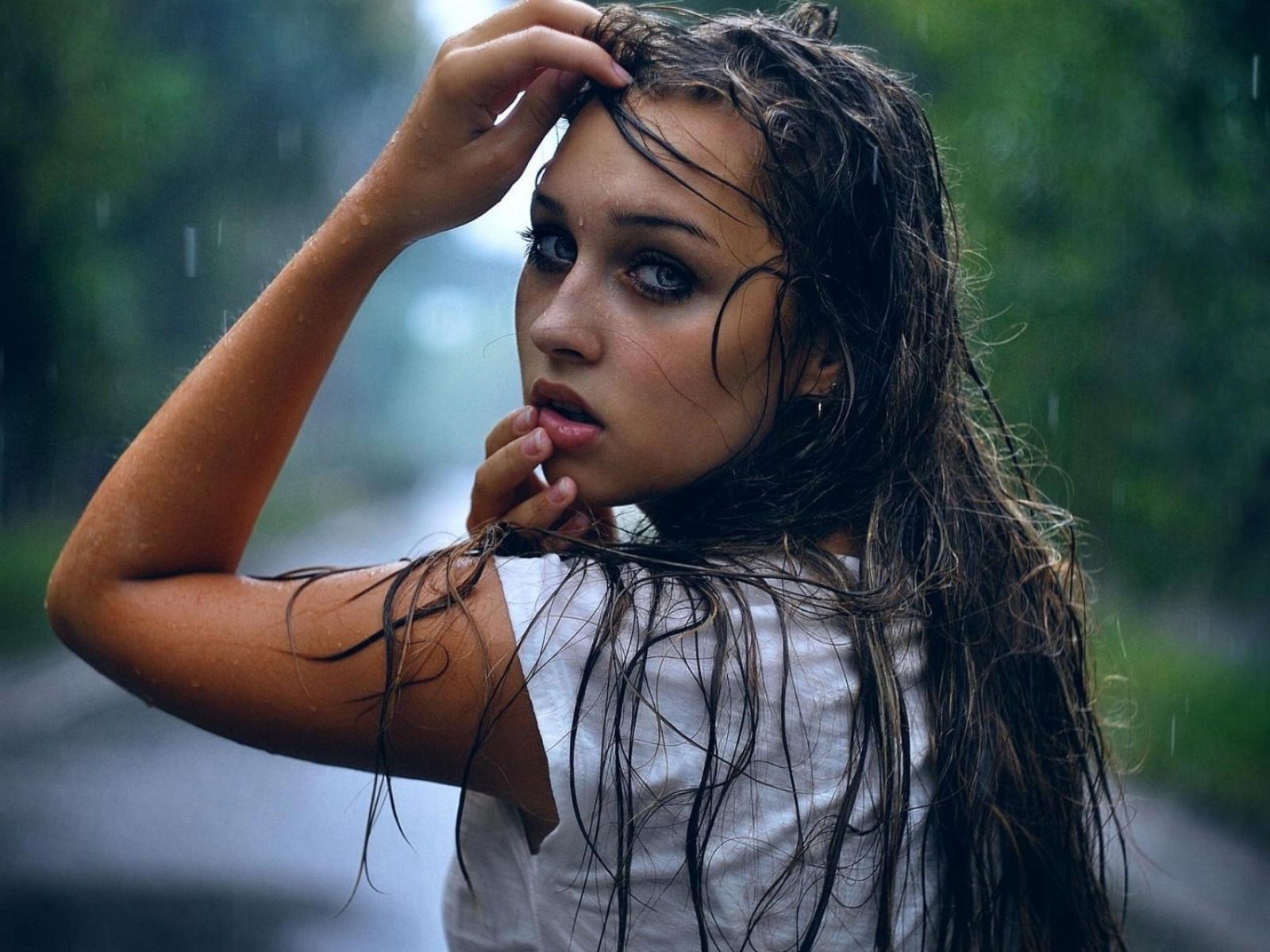 Обои Девушка брюнетка вымокла под дождем