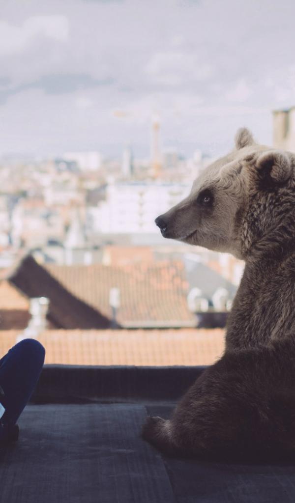 Обои Девушка с медведем на крыше