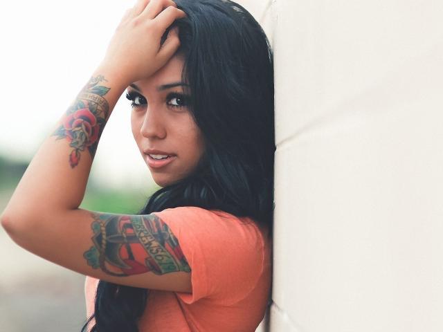 Обои Страстная длинноволосая брюнетка прислонилась к стене