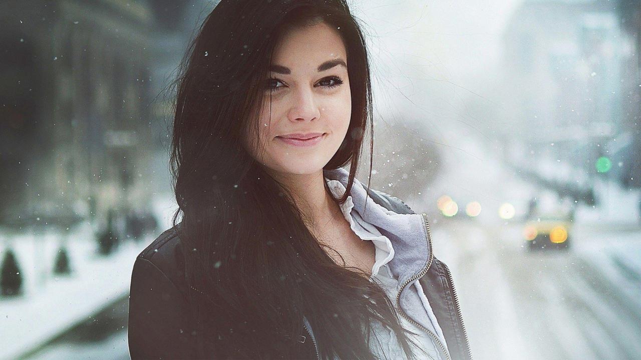 Обои Девушка брюнетка среди снегопада