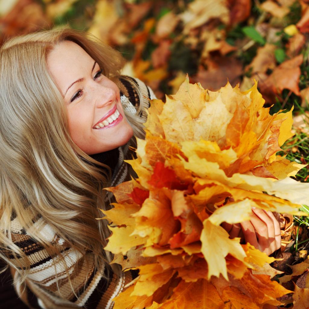 Обои Листья, Длинные волосы, лежит, Осенние листья