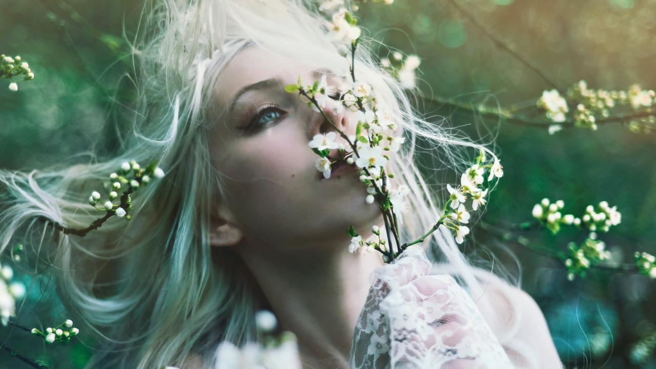 Обои Голубые глаза, Красивые глаза, цветущая яблоня