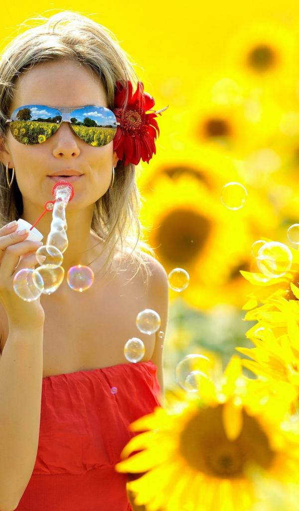 Обои Пузыри, Подсолнухи, Мыльные пузыри, Красное платье