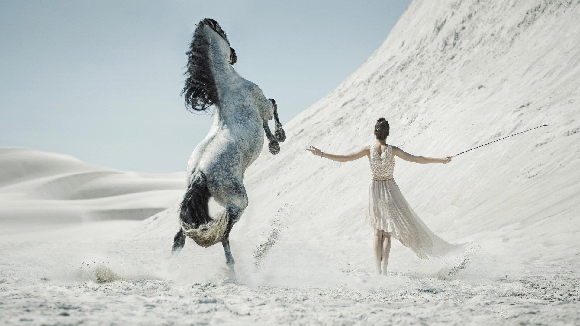 Обои Девушка укрощает лошадь