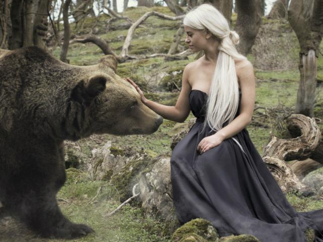 Обои Девушка играет с медведем
