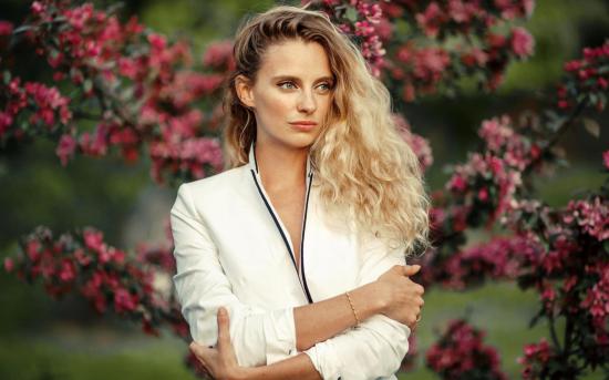 Обои Голубоглазая блондинка на фоне цветущих деревьев