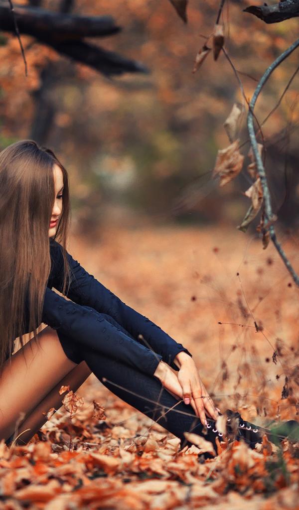 Обои Девушка сидит на осенней листве