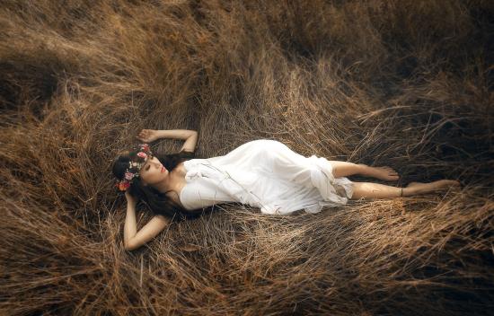 Обои Девушка в белом платье с украшением в волосах лежит на траве
