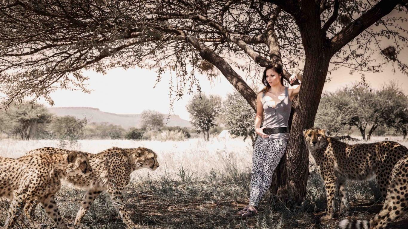 Обои Девушка среди леопардов