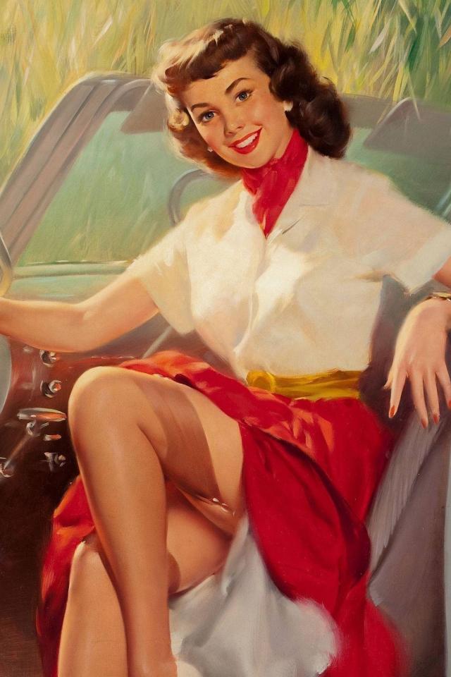 Обои Ретро девушка в белом платье у ретро автомобиля