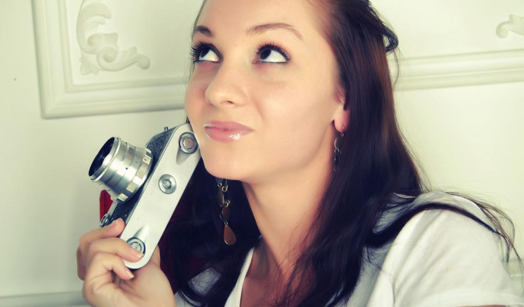 Обои Брюнетка с фотоаппаратом