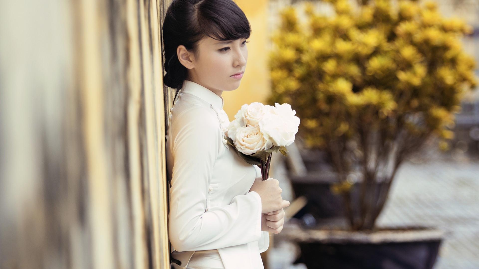 Обои Девушка с букетом белых роз