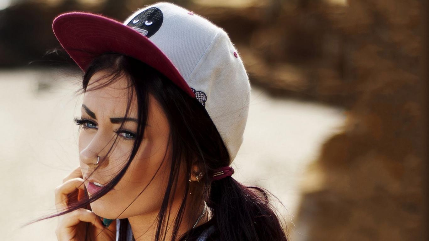 Обои Девушка брюнетка в кепке и с пирсингом в носу