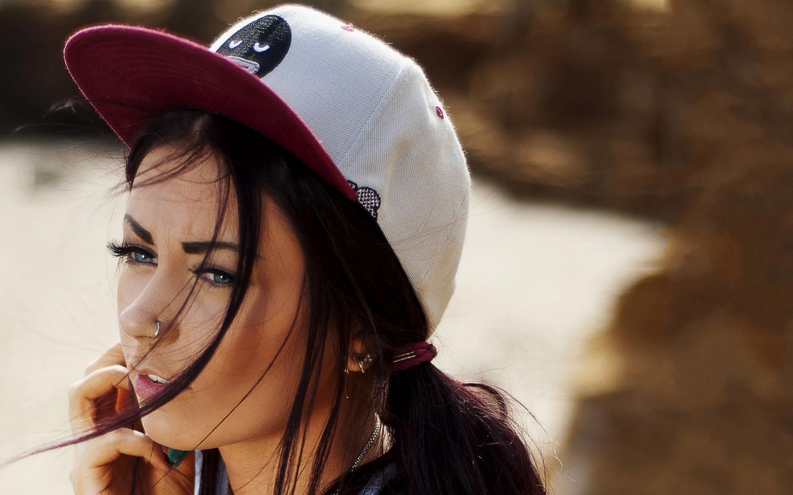 Обои Девушка брюнетка в кепке и с пирсингом в носу