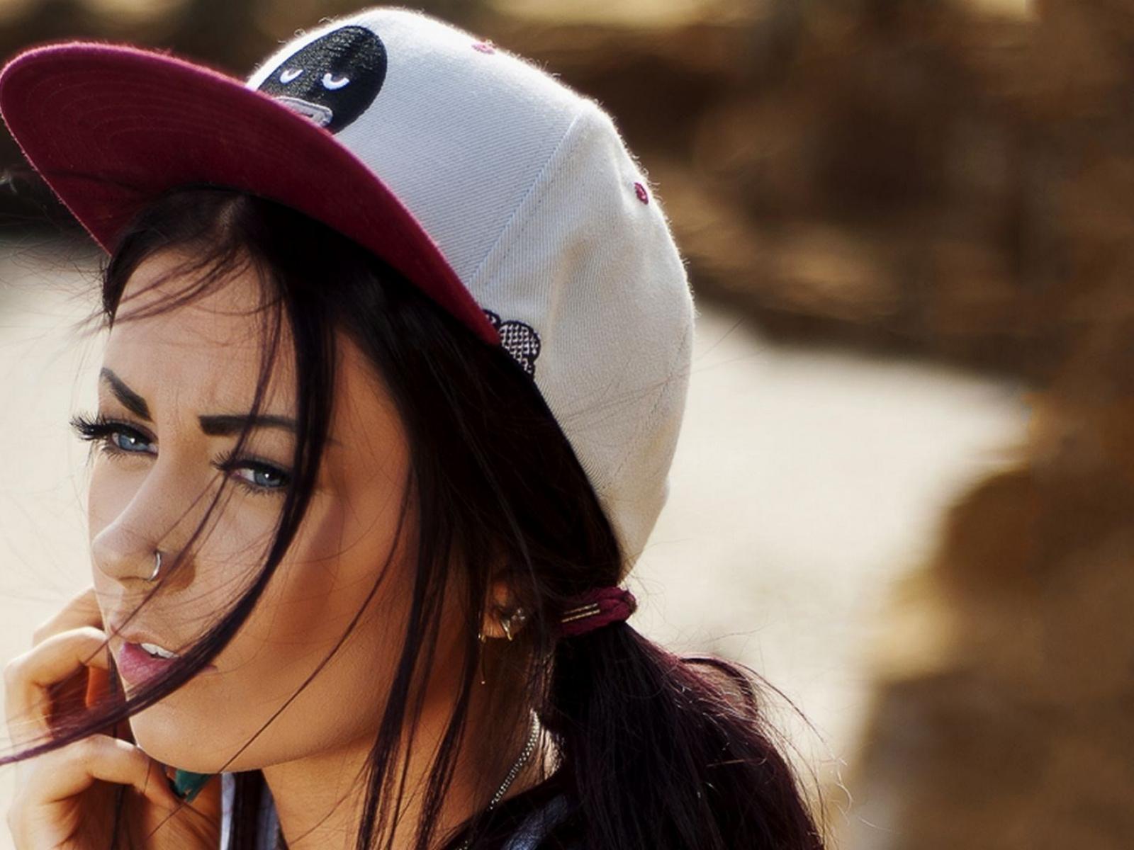 Обои Девушка брюнетка в кепке и с пирсингом в носу