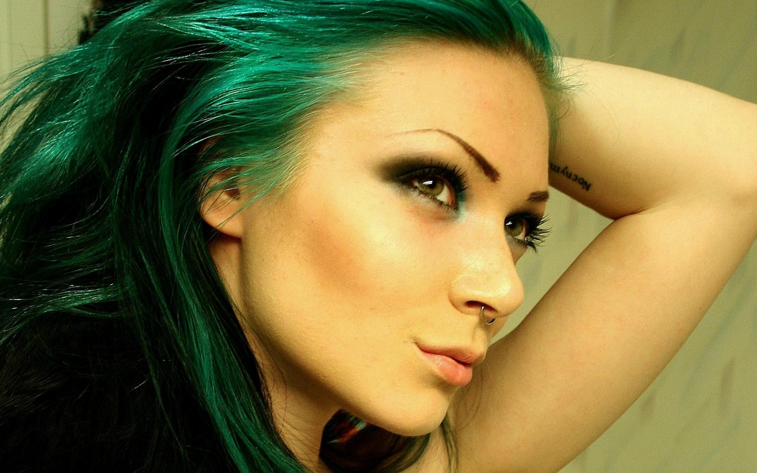 Обои Девушка зеленоволосая с пирсингом в носу и татуировкой на руке